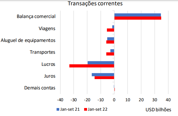A avaliação é do Itaú BBA. De acordo com análise do banco, registaram-se em ambos meses saídas ligeiramente superiores às esperadas de juros e lucros e dividendos. O banco relata ainda conta corrente piorando na margem, com a balança comercial perdendo força. Já o fluxo de investimento estrangeiro para o Brasil continua positivo. O banco projeta um déficit em conta corrente de US$ 42 bilhões em 2022.