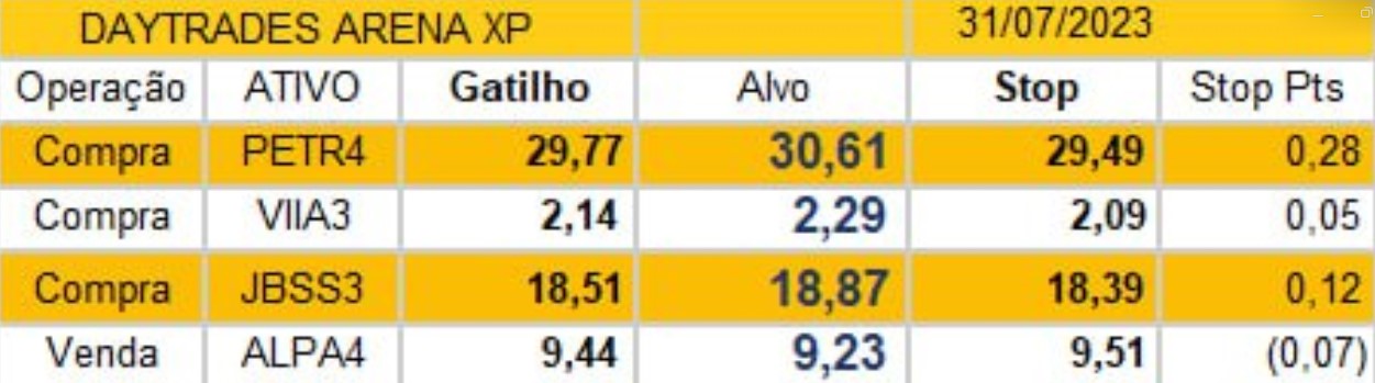 | Ativo | Julho (%) | Dia (%) | Valor (R$) | Semana (%) | 2023 (%) | |