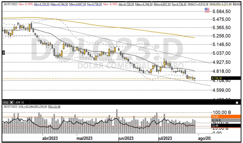 O dólar caiu frente ao real, no mesmo movimento da divisa norte-americana na comparação com as principais moedas do mundo: o índice DXY ficou com uma queda de 0,15%. O câmbio caiu na medida que os EUA anunciaram um PCE mais favorável ao Fed pensar em brecar a alta de juros.