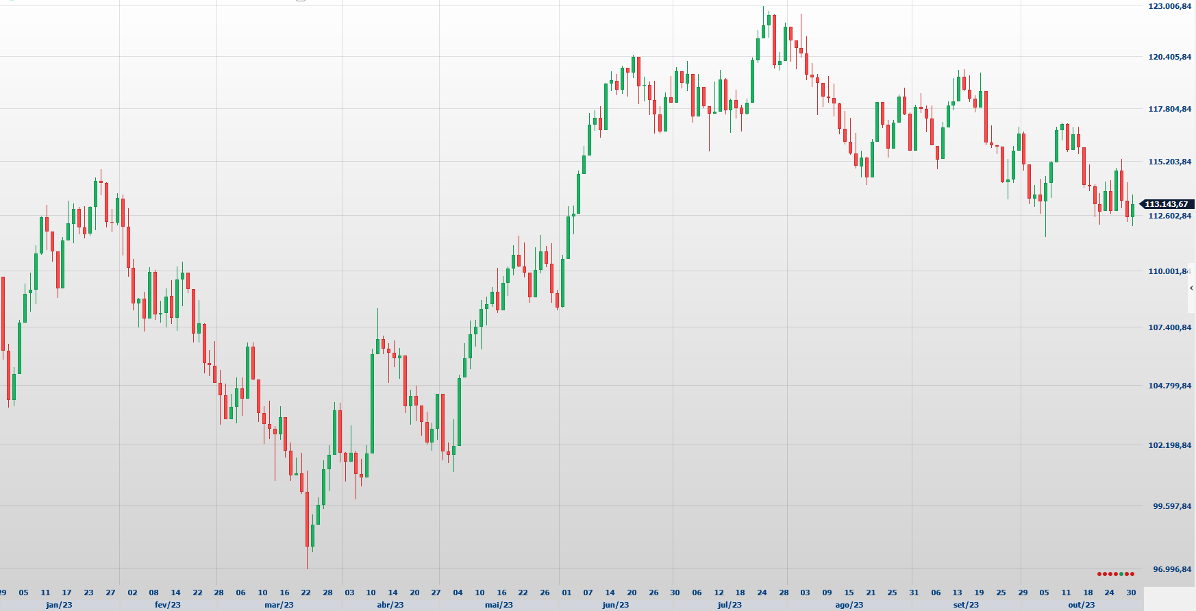 Ibovespa em outubro oscilou entre a mínima de 111.598 pontos e a máxima de 117.098 pontos