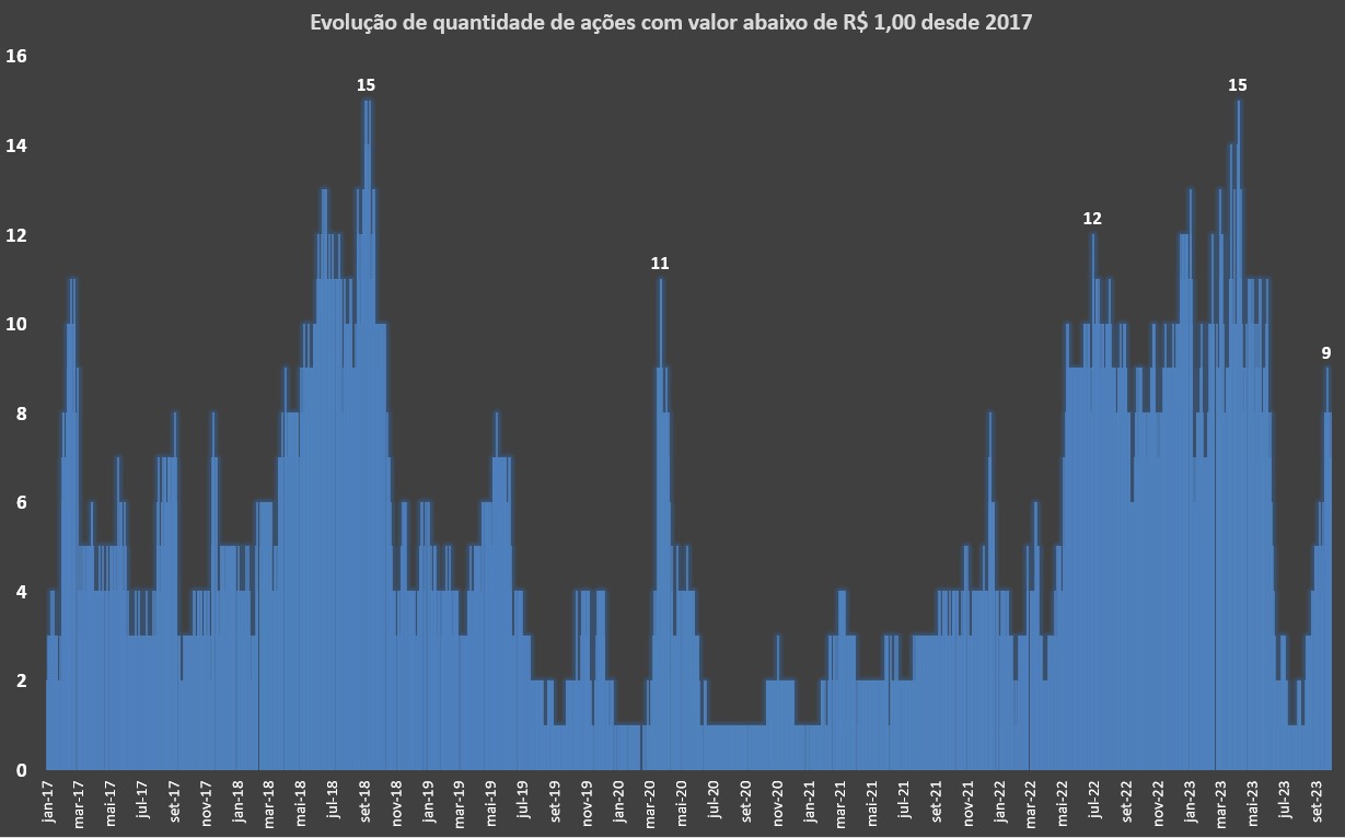 De acordo com dados da Economatica compilados a pedido do InfoMoney, atualmente a Bolsa brasileira conta com nove penny stocks, sendo que no pico do ano, por volta de março, 15 ações chegaram a ser negociadas a menos de R$ 1.