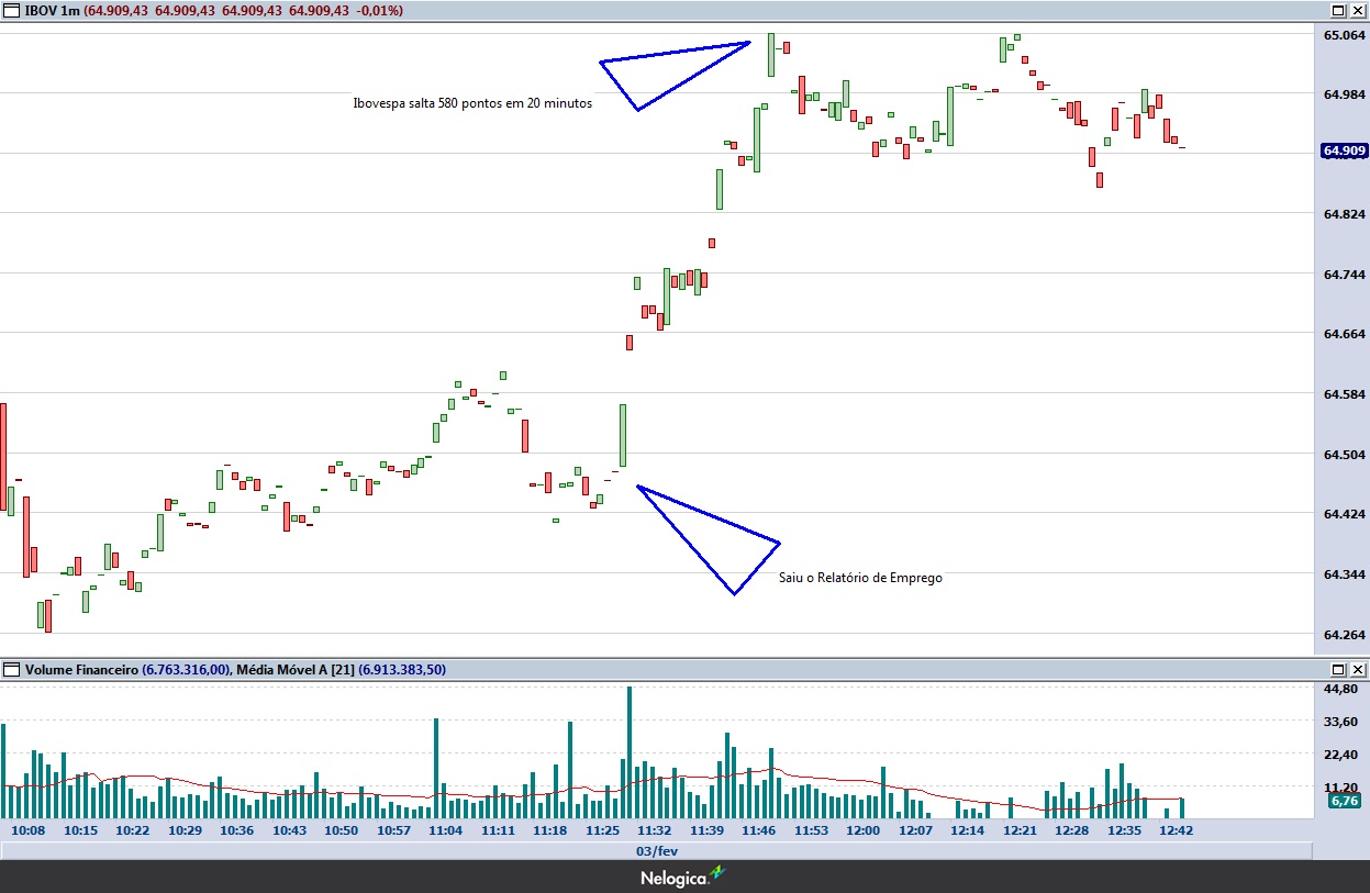 Mas não era esse o retrato do mercado às 13h55 (horário de Brasília): o Ibovespa operava na máxima do dia, com alta de 1,01%, a 65.232 pontos – ou 670 pontos acima do observado antes do Payroll -, enquanto o contrato futuro do dólar caía 0,65%, a R$ 3.126, na mínima dessa sessão.