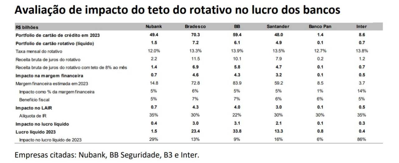 Para eles, o banco Inter (INBR32) e o Nubank (INBR32) seriam, de longe, os mais afetados dentro da sua cobertura, considerando apenas os impactos primários do teto na taxa do rotativo.