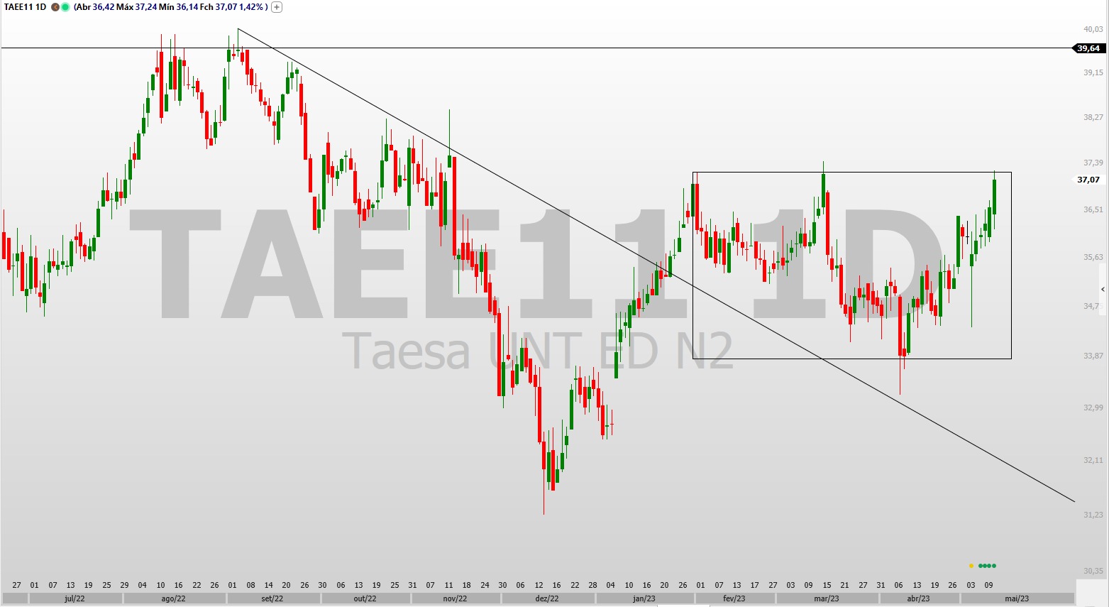 Desde fevereiro, a ação estava em consolidada no meio de uma lateralização maior [veja o gráfico abaixo], porém, com os últimos movimentos de valorização (posteriores ao balanço), a ação da Taesa “chegou na região de topos anteriores, em R$ 37,20.”
