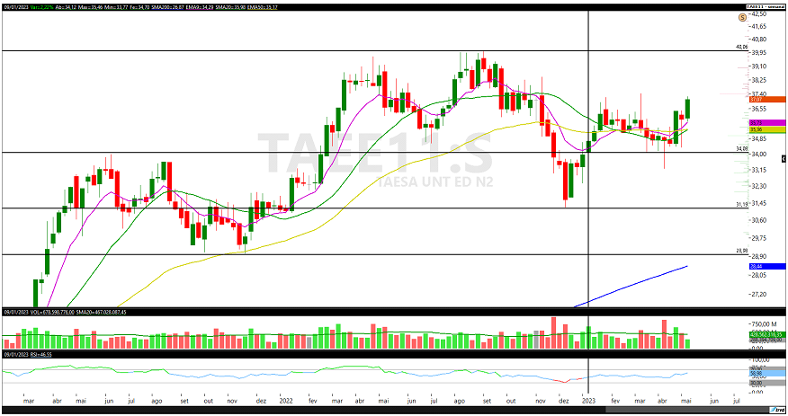 As ações da Taesa (TAEE11) acumulam valorização superior a 11% neste ano e se aproximam de importante ponto de resistência. Na última sexta-feira (12), as ações subiram 0,32%, fechando cotadas a R$ 37,19. Em maio, os papéis sobem 2,2% e em 12 meses avançam 0,67%.