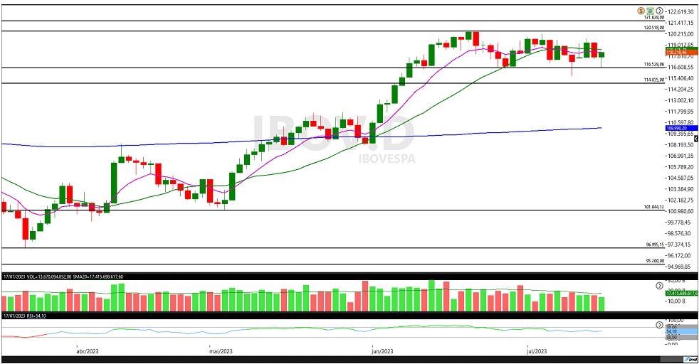 Para os analistas técnicos do Itaú BBA, Fábio Perina, Lucas Piza e Igor Caixeta, o Ibovespa se encontra próximo de ponto de suporte. Ontem (17), por exemplo, a Bolsa, na mínima, marcou os 116.500 pontos, “bem próximo a região de suporte em 116.300/115.700 pontos”.