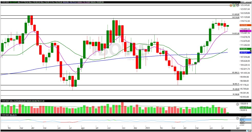 Gráfico semanal do Ibovespa: janeiro/2020 a julho/2023