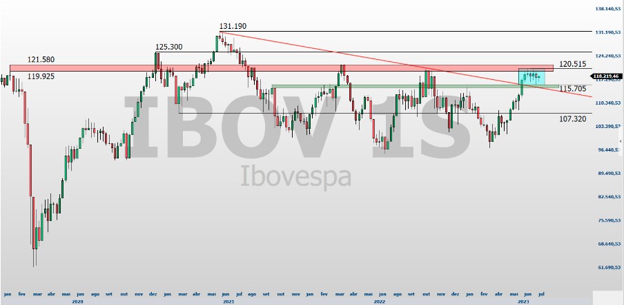 Para Lima, é possível observar que, no médio prazo, após o rompimento de uma linha de tendência de baixa (LTB) [veja a linha vermelha do gráfico abaixo], o índice Ibovespa (IBOV) está em sua sexta semana consecutiva sendo negociado em uma consolidação, entre os 120.515 e 115.705 pontos, “uma região extremamente relevante”.