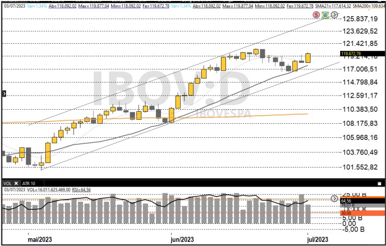 Segundo relatório de análise técnica da XP, o Ibovespa (IBOV) está em tendência de alta pelas médias de 21 e 200 dias e superando os 120.000 projetaria teste dos 124.000 ou 128.000.