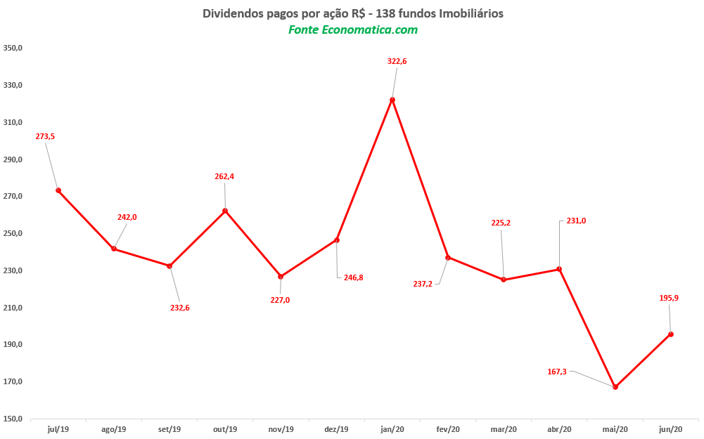 Para se ter uma ideia do estrago causado, considerando um grupo composto pelos 138 fundos imobiliários com informações disponíveis nos últimos 12 meses até junho, a soma total do pagamento de dividendos foi de R$ 322,6, em janeiro. Esse seria o volume de dividendos que um investidor receberia se tivesse uma cota de cada um dos 138 fundos.
