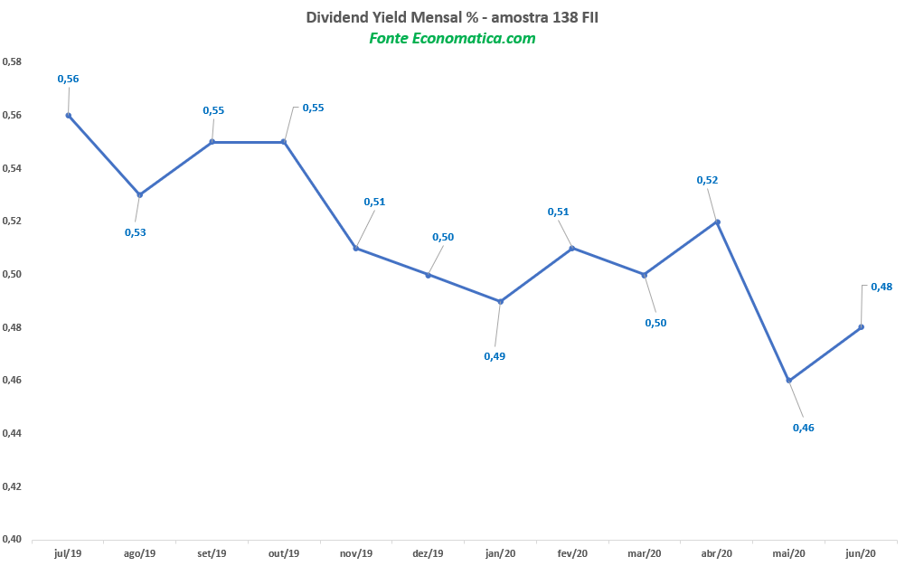 Quando analisada a mediana de dividend yield mensal da carteira, a taxa de 0,49%, paga em janeiro deste ano, caiu para 0,46%, em maio.