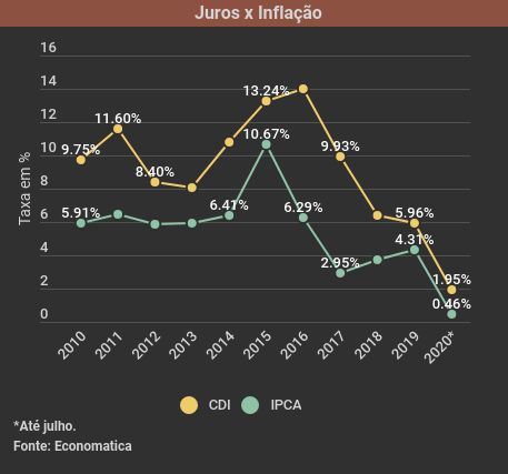 A situação é inusitada. Nos últimos dez anos, a inflação sempre ficou abaixo do CDI, ainda que tenha superado o retorno da caderneta de poupança em alguns períodos, inclusive em 2019.