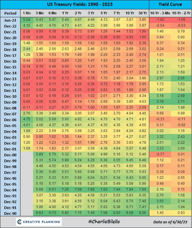 Encontrei no Twitter dia desses essa linda tabela abaixo. Ela mostra as taxas do tesouro americano ao longo dos anos, desde 1990 até 2023, para ser mais exato.