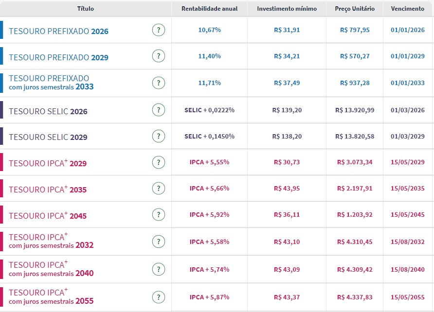 Confira os preços e as taxas dos títulos públicos disponíveis para compra no Tesouro Direto na manhã desta terça-feira (10):