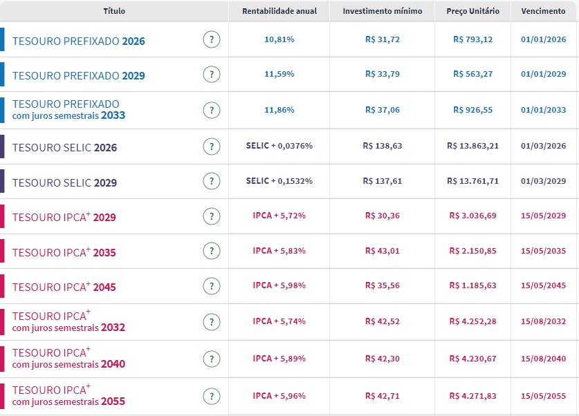 Confira os preços e as taxas dos títulos públicos disponíveis para compra no Tesouro Direto na manhã desta quinta-feira (28):