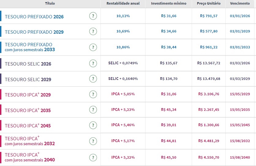 Confira os preços e as taxas dos títulos públicos disponíveis para compra no Tesouro Direto na manhã desta segunda-feira (31):