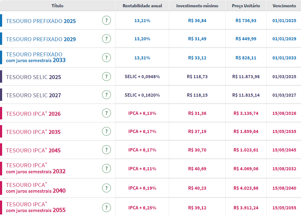 Confira os preços e as taxas de todos os títulos públicos disponíveis para compra no Tesouro Direto na tarde desta quinta-feira (14):