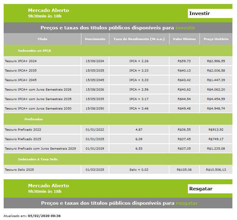 Confira, a seguir, os preços e as taxas dos títulos disponíveis no Tesouro Direto: