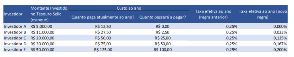 Com a mudança, o primeiro investidor ficará totalmente isento de taxa. O segundo, por sua vez, só terá custo referente à taxa de custódia sobre o valor de R$ 1 mil. E o terceiro pagará taxa referente aos R$ 10 mil excedentes.
