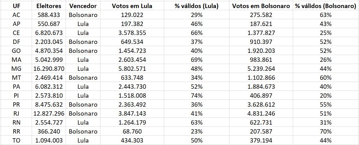 Destas, Lula foi o mais votado em 8 (AP, CE, MA, MG, PA, PI, RN e TO) no dia 2 de outubro, e Bolsonaro em 7 (AC, DF, GO, MT, PR, RJ e RO).