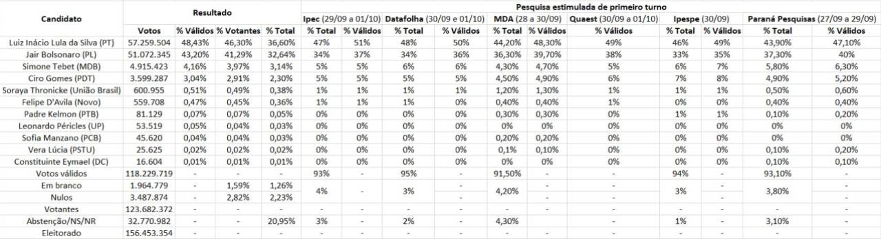 Para votos totais, as indicações dos institutos para Lula variaram de 43,90% (Paraná Pesquisas) a 48% (Datafolha) – ou seja, de -2,4 a +1,7 pontos em relação ao resultado das urnas, desconsiderando abstenções, ou de +7,3 a +11,4 pensando no universo de eleitores aptos a votar.