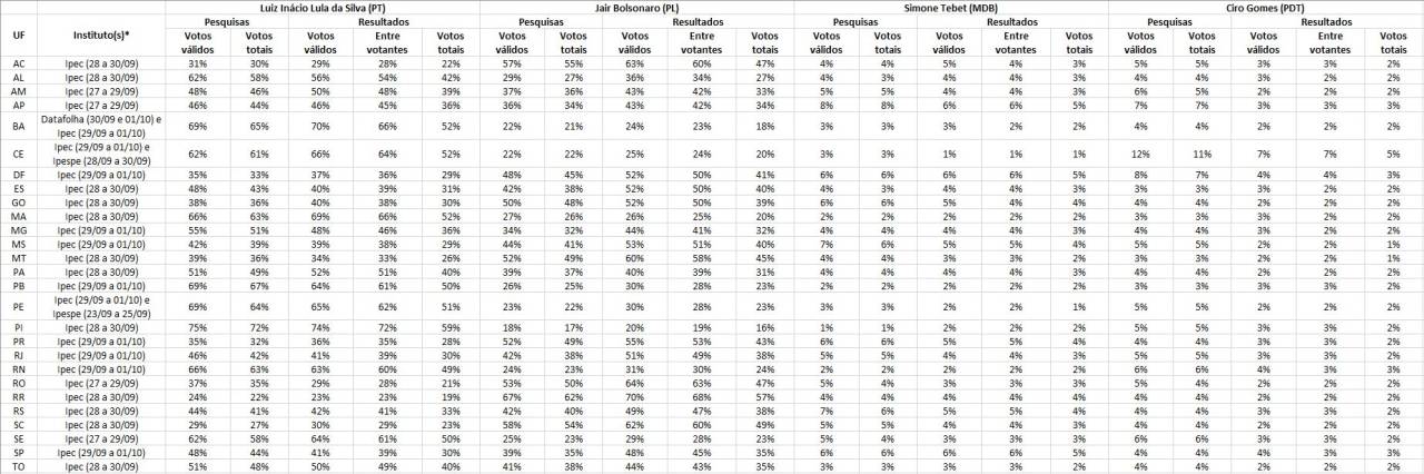 Veja o quadro comparativo com a última leva de pesquisas e o resultado nas urnas do primeiro turno da corrida presidencial nas 27 Unidades da Federação (para visualizar em tamanho maior, clique aqui):