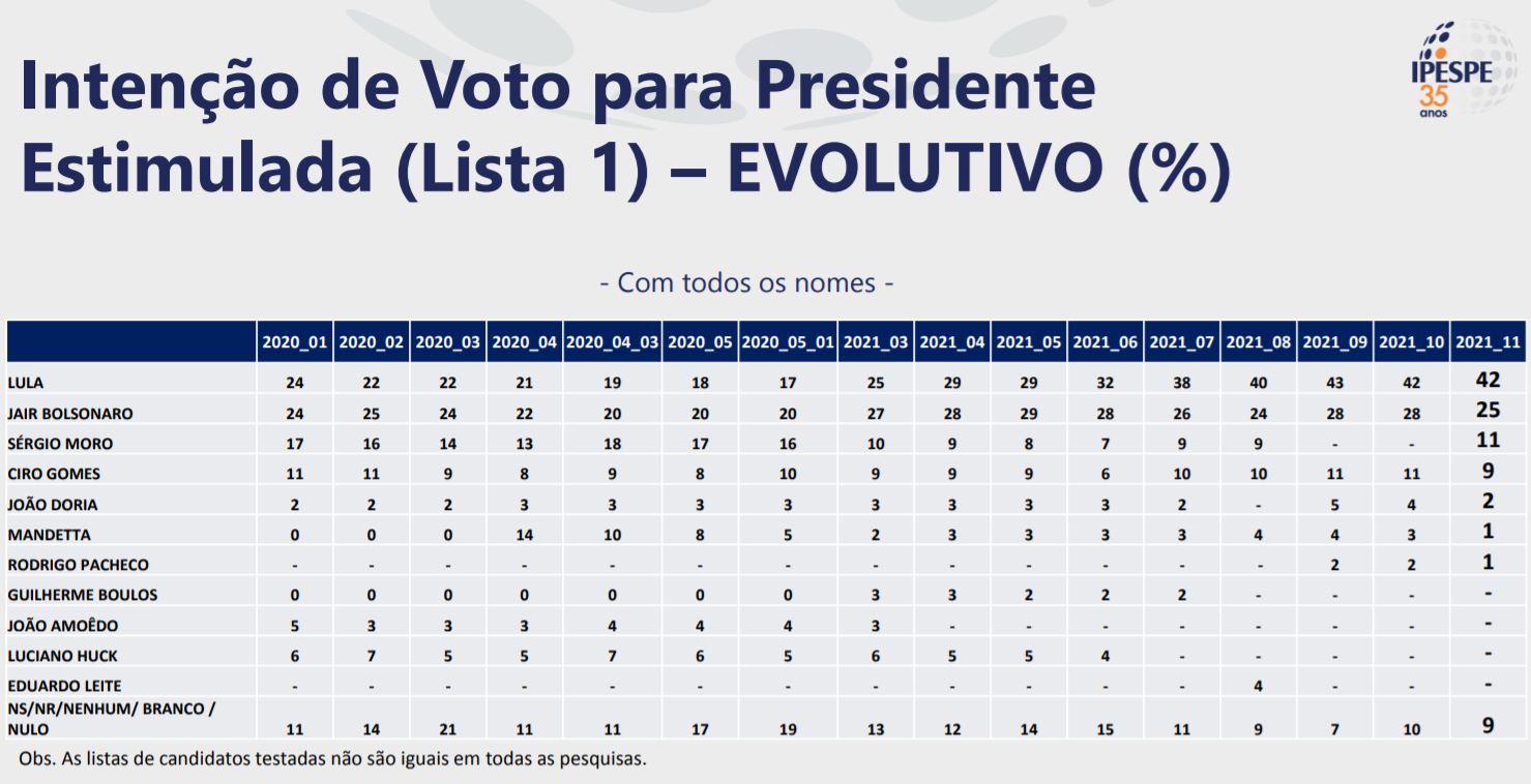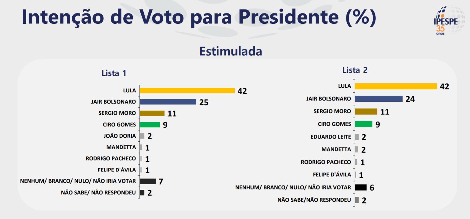 Segundo a pesquisa, Lula mantém 42% das intenções de voto nas duas simulações estimuladas de primeiro turno (isto é, quando o eleitor escolhe seu candidato entre opções apresentadas pelo apresentador). Ele é seguido pelo presidente Jair Bolsonaro (sem partido), que aparece com 25% ou 24% das menções, dependendo da lista de candidatos.