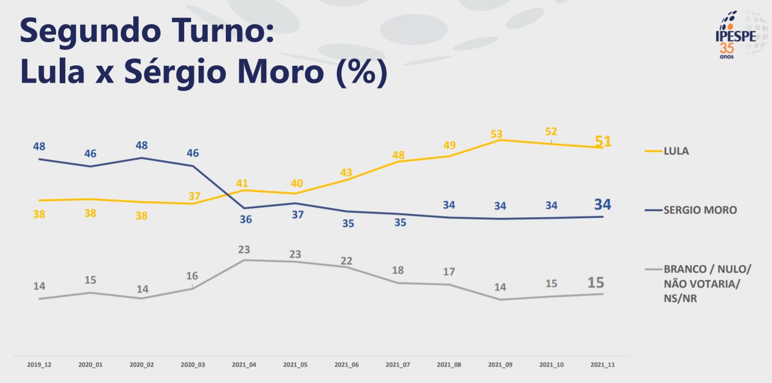 Quando testado com Moro, Lula aparece com 51% das intenções de voto, contra 34% do ex-juiz. Seis meses atrás, a diferença era de 3 p.p., o que configurava empate técnico. Moro chegou a liderar a disputa com vantagem superior à margem de erro em três pesquisas realizadas no ano passado.