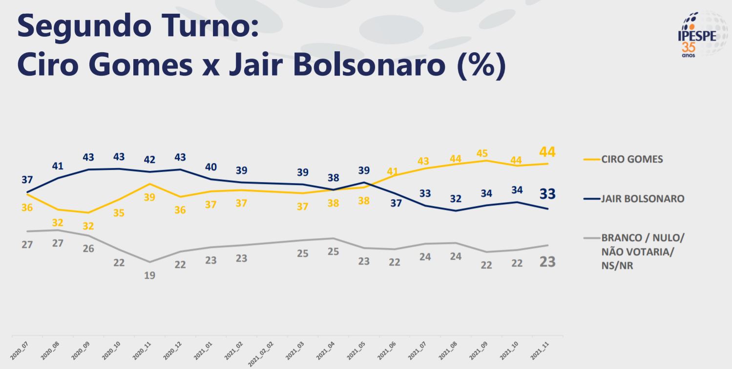 Além do cenário contra Lula, o nome de Bolsonaro é testado contra três potenciais adversários. O presidente não aparece à frente em nenhuma simulação. Contra Ciro Gomes, a distância cresceu para 11 pontos percentuais (44% a 33%).