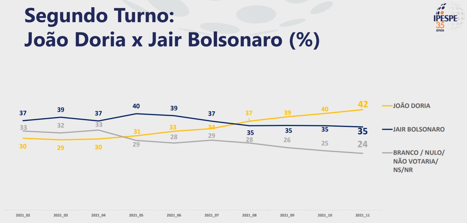 Contra Doria, a desvantagem de Bolsonaro chegou a 7 p.p. (42% a 35%) – a maior já registrada nesta simulação e superior à margem de erro. Já contra Leite o quadro é de empate (35% a 35%).