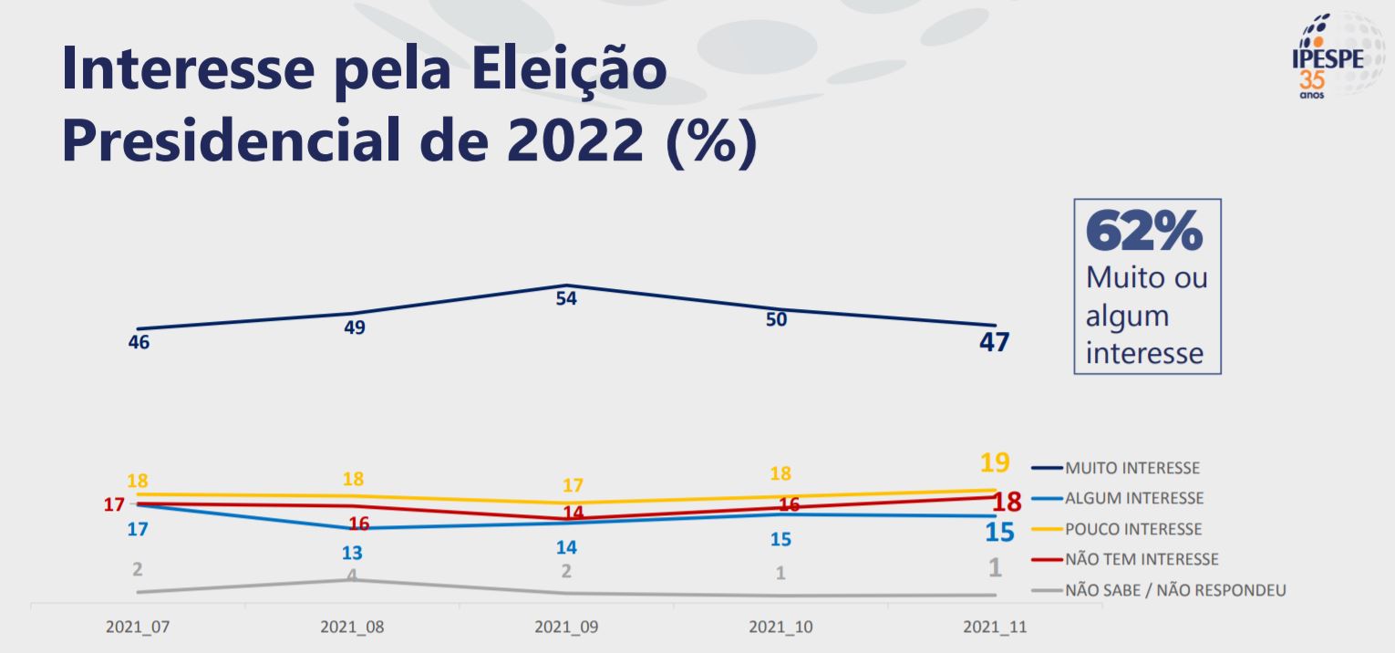 O levantamento também mostrou um leve recuo no grau de interesse dos eleitores no pleito de 2022. Segundo a pesquisa, 47% dizem estar muito interessados na disputa – 7 pontos percentuais a menos do que no pico observado em setembro.