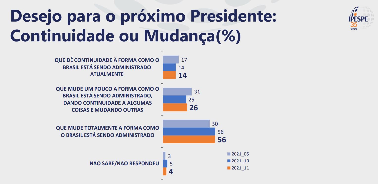 A maioria dos eleitores (56%) diz desejar que o próximo presidente mude totalmente a forma como o Brasil está sendo administrado. Outros 26% querem que o eleito mude um pouco a forma como o país está sendo conduzido, ao passo que 14% querem continuidade.