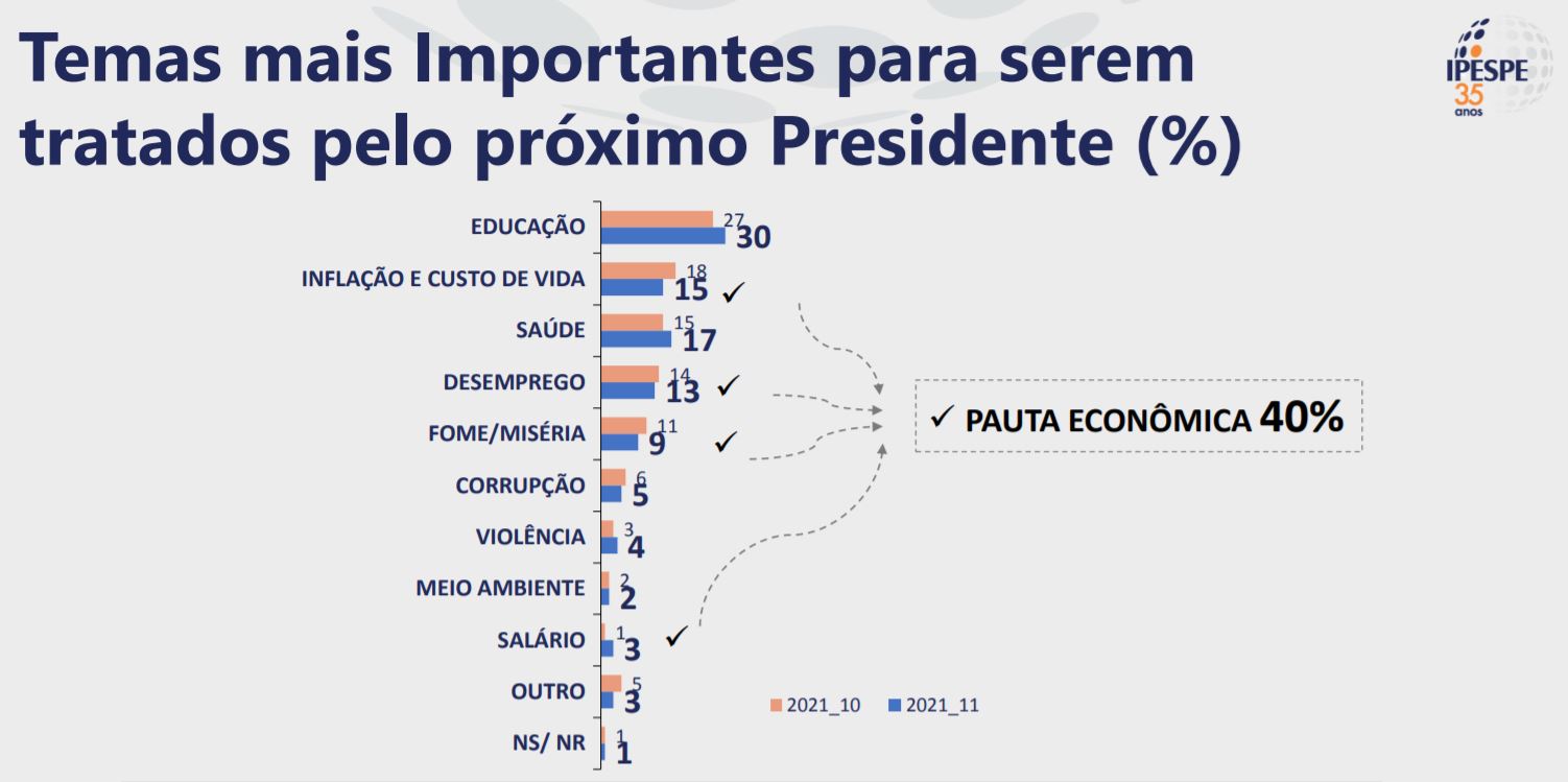 O tema mais citado pelos entrevistados foi a educação (30%), seguido de inflação e custo de vida (15%), saúde (17%), desemprego (13%) e fome/miséria (9%). Ao todo, 40% das preocupações estão diretamente relacionadas à pauta econômica.