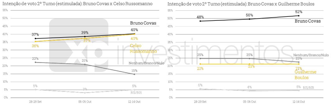 O levantamento também mostra Russomanno e Covas numericamente empatados em eventual segundo turno, ambos com 40%. Vale ressaltar que saiu de 21% para 15% os que dizem não saber em quem vão votar ou que votariam nulo ou em branco. Na simulação, ambos oscilaram dois pontos positivos em relação à semana passada. Os dois venceriam os rivais França e Boulos nos outros cenários testados.
