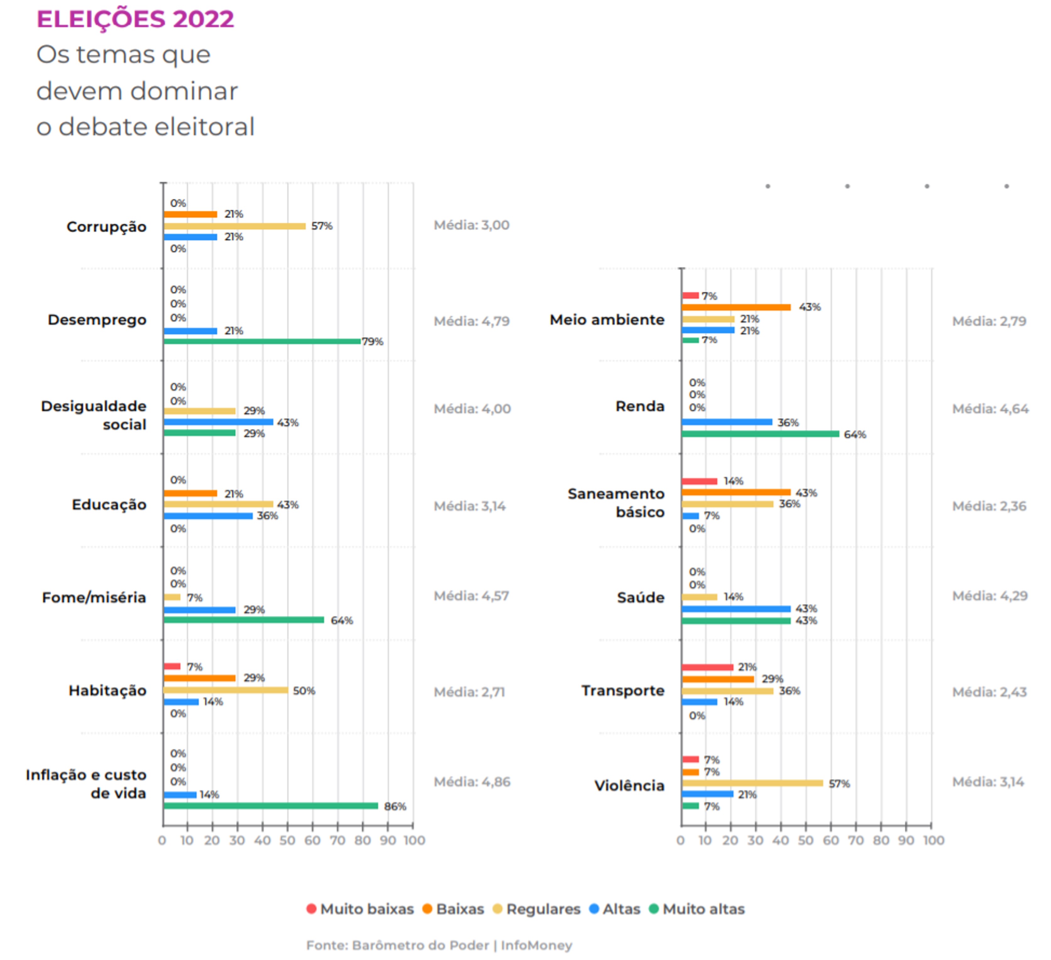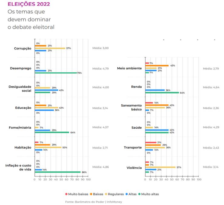 O Barômetro mostra que, considerando uma escala de 1 (muito baixo) a 5 (muito alto), a média das avaliações dos especialistas indica que o enfrentamento aos chamados “crimes de colarinho branco” poderia ter impacto de 3,00 sobre a decisão de voto do eleitor, ficando atrás de ao menos 8 temas: inflação (4,86), desemprego (4,79), renda (4,64), fome (4,57), saúde (4,29), desigualdade social (4,00), educação (3,14) e violência (3,14).