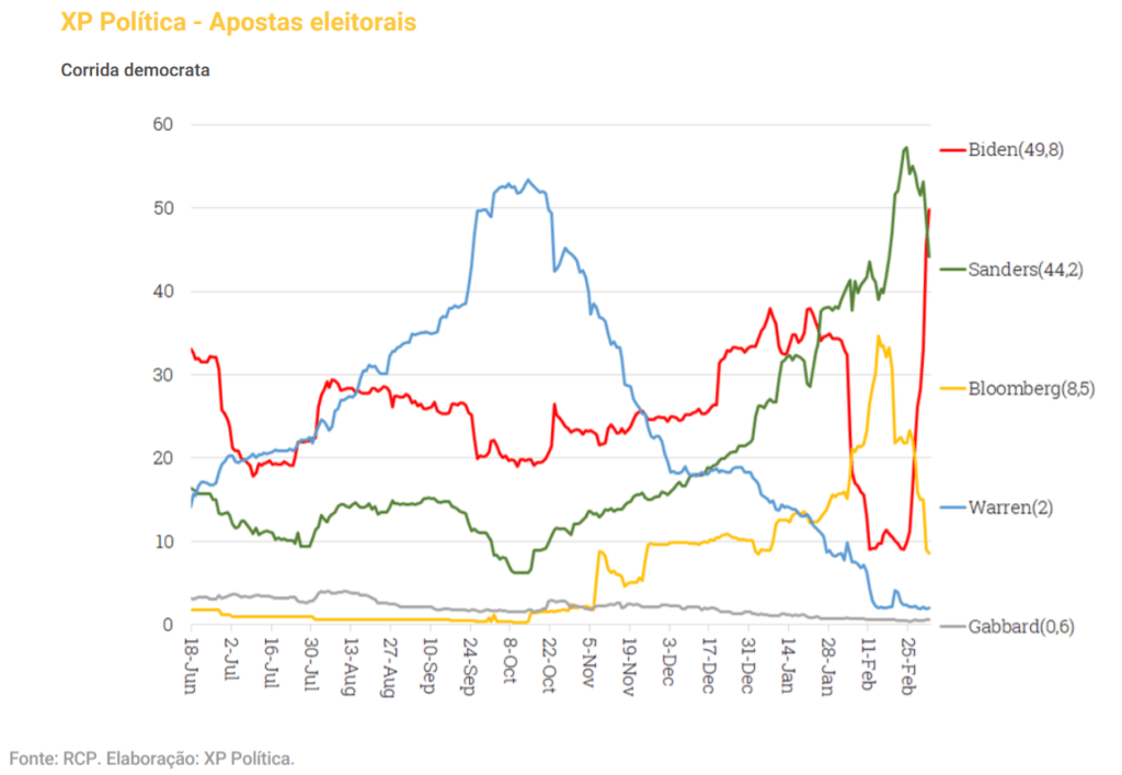 “A vitória de Biden implica complicação para a candidatura de Michael Bloomberg, que não participou das primárias nos ‘early-states’, como são chamados os primeiros quatro estados no calendário eleitoral”, aponta a XP Política.