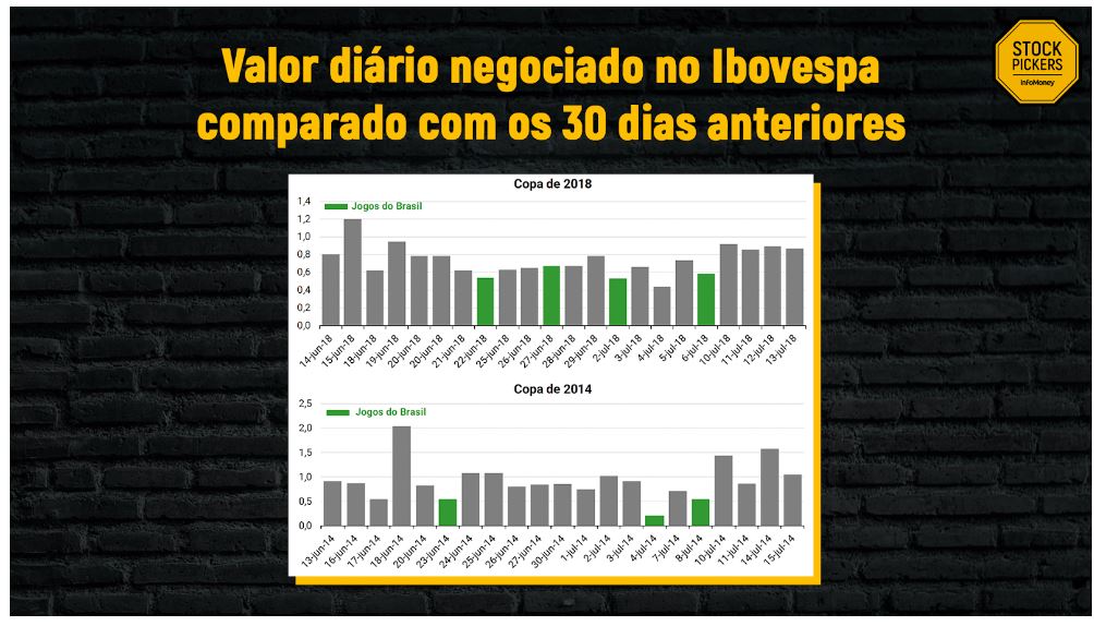 Outro dado interessante apontado pelo relatório e abordado no episódio 173 do podcast Stock Pickers, é que, durante a Copa, em especial jogos do Brasil, o volume negociado da nossa bolsa cai bastante, como aponta a tabela abaixo.