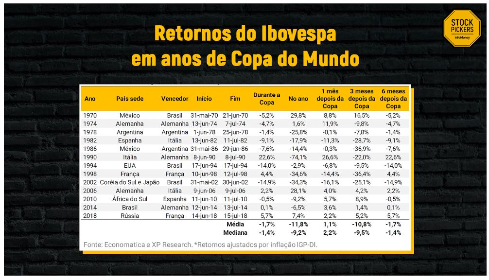 Se você quiser saber mais sobre Copa do Mundo, com uma abordagem que traz tanto o aspecto esportivo quanto o de negócios, não deixe de assistir ao episódio #173 do Stock Pickers, que contou com as participações de Mauro Beting, jornalista, cronista e comentarista esportivo, Júlia Aquino, Analista Quantitativa da XP e Fernando Ferreira, Estrategista chefe da XP.